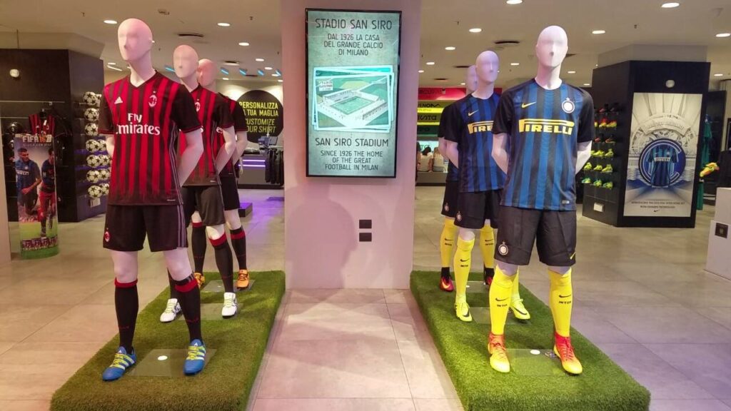 მილანის ორ მთავარ საფეხბურთო გუნდს: მილანს და ინტერს უზარმაზარი მაღაზიები აქვთ მილანში. ოფიციალური მერჩენდაიზინგის გამო რა თქმა უნდა ფასები იმაზე მაღალია, ვიდრე რიგითი მაღაზიის მსგავსი პროდუქცია. მაგრამ, არის ფასდაკლებებიც.