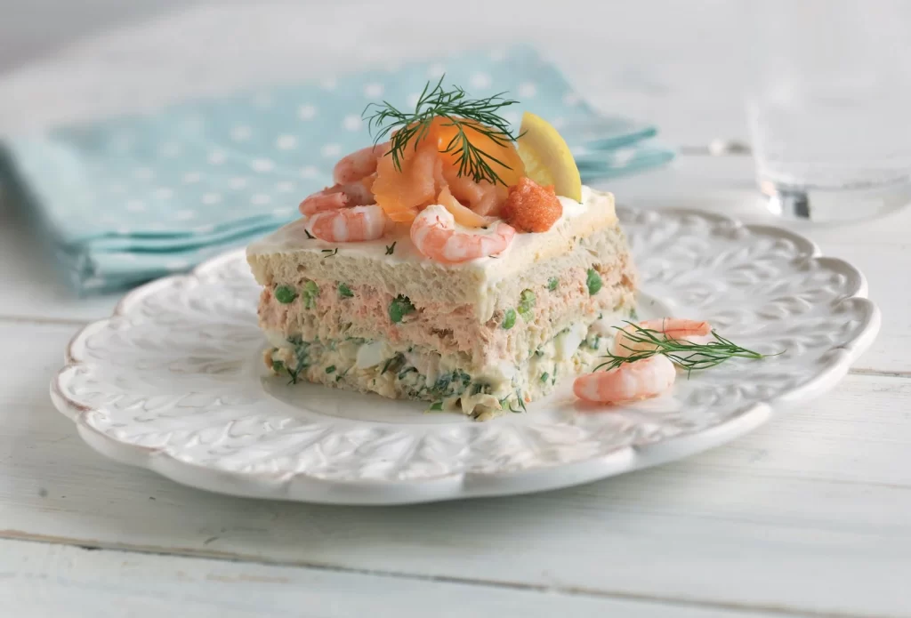 “ნამცხვარი-სენდვიჩი” ნამდვილად მოიხიბლებით თუ ნამცხვრებიც გიყვართ და სენდვიჩებიც. პურის ფენები შევსებულია კვერცხით ან კრევეტებით, დამატებული აქვს მაიონეზი, ყველი, კიტრი, პომიდორი და ლიმნის წვენი.