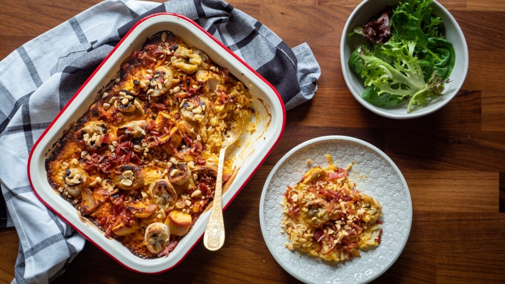 ამ კერძის ცენტრალური ინგრედიენტი ქათამია, რომელიც ცხარე სოუსით, რძით და კრემით ჯერდება. მას დიდ ჯამში ამზადებენ და ტოპინგად ბეკონსაც კი უმატებენ. ტკბილი, მარილიანი, კრემის და ცხარე – ეს რეცეპტი ყველანაირად ხასიათდება.
