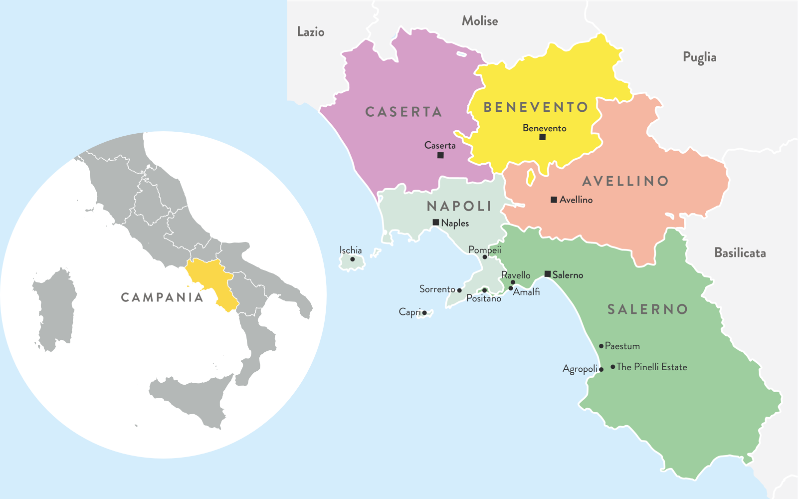 კამპანიის მთავარი ქალაქებია: ნეაპოლი, სორენტო და სალერნო.