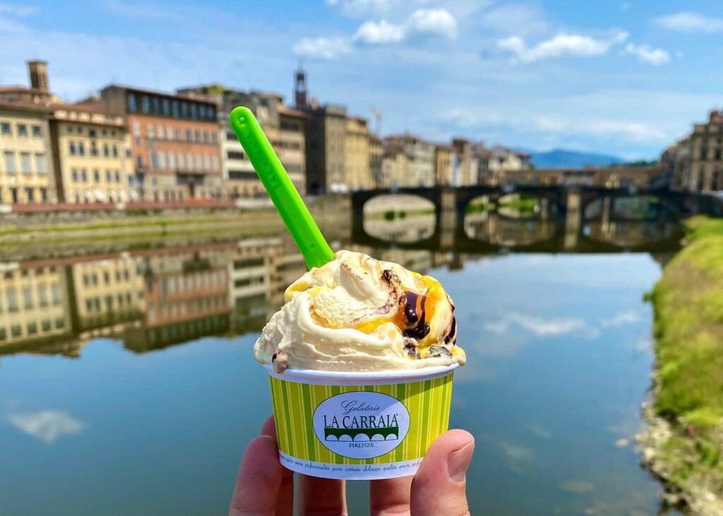 ცნობილი ჟელატოს დაგემოვნების გარეშე ფლორენცია არ უნდა დატოვოთ. ეს ნაყინი სწორედ ამ ქალაქში შეიქმნა, ამიტომაც ფლორენცია საუკეთესოა ადგილია მის დასაგემოვნებლად. პიაცა დელა სინორიადან გადადით ფლორენციის ყველაზე ძველ და ცნობილ ხედზე, პონტე ვექიოზე, როგორც კი მეორე მხარეს მოხვდებით, ჩადით ქვევით ბორგო სან ჯაკოპოზე და იარეთ მდინარის ნაპირზე იქამდე, სანამ პიაცა ნაზარიო საუროსთან არ მოხვდებით. აქ La Carraia დაგხვდებათ, საუკეთესო ჟელატოს ადგილი, რომელსაც მწვანე და ყვითელი საცნობი ნიშანი გამოარჩევს. რა თქმა უნდა, დიდი რიგიც მიგანიშნებთ რომ სწორად მოხვედით. კლასიკური იტალიური ნაყინის დაგემოვნება თუ გსურთ, კრემით, შოკოლადით და არაქისით შეუკვეთეთ.